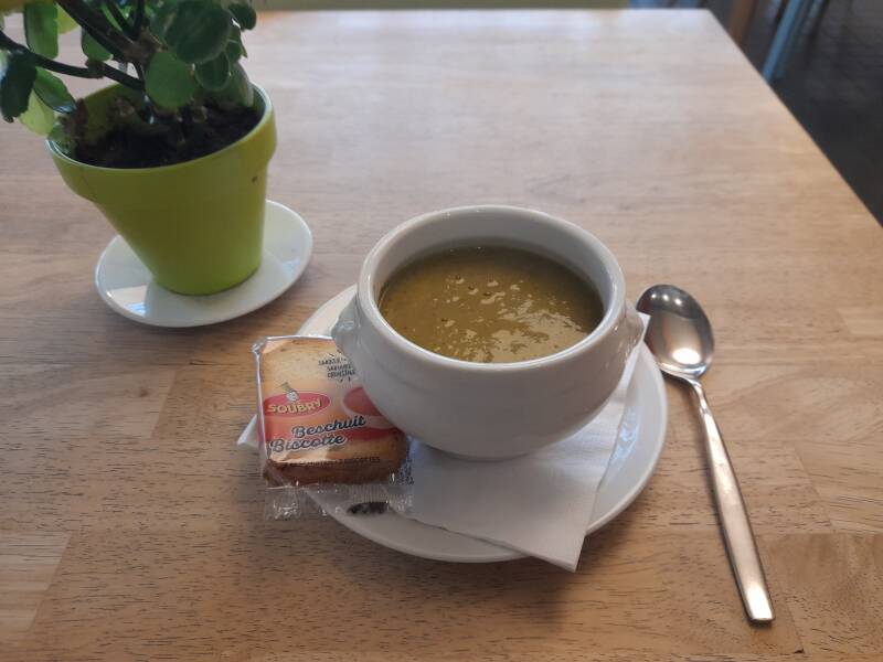 Vandaag heb ik, na weer een wandeling van 6 kilometer in het kader van een geldinzamelingsactie voor Kom op tegen Kanker, wat selder soep gegeten in de cafetaria van de Bourgoyen.