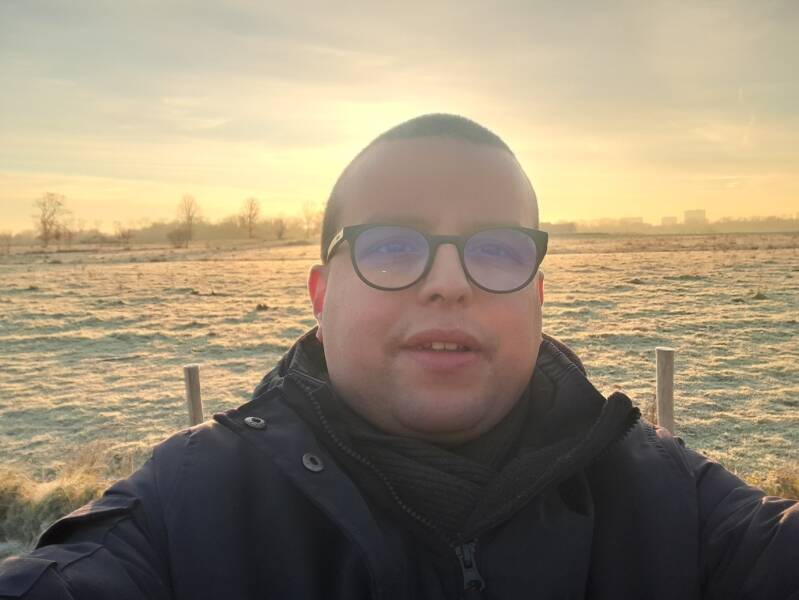 Hieronder zie je een foto van mij en de zonderondergang op de achtergrond, genomen tijdens mijn wandeling.